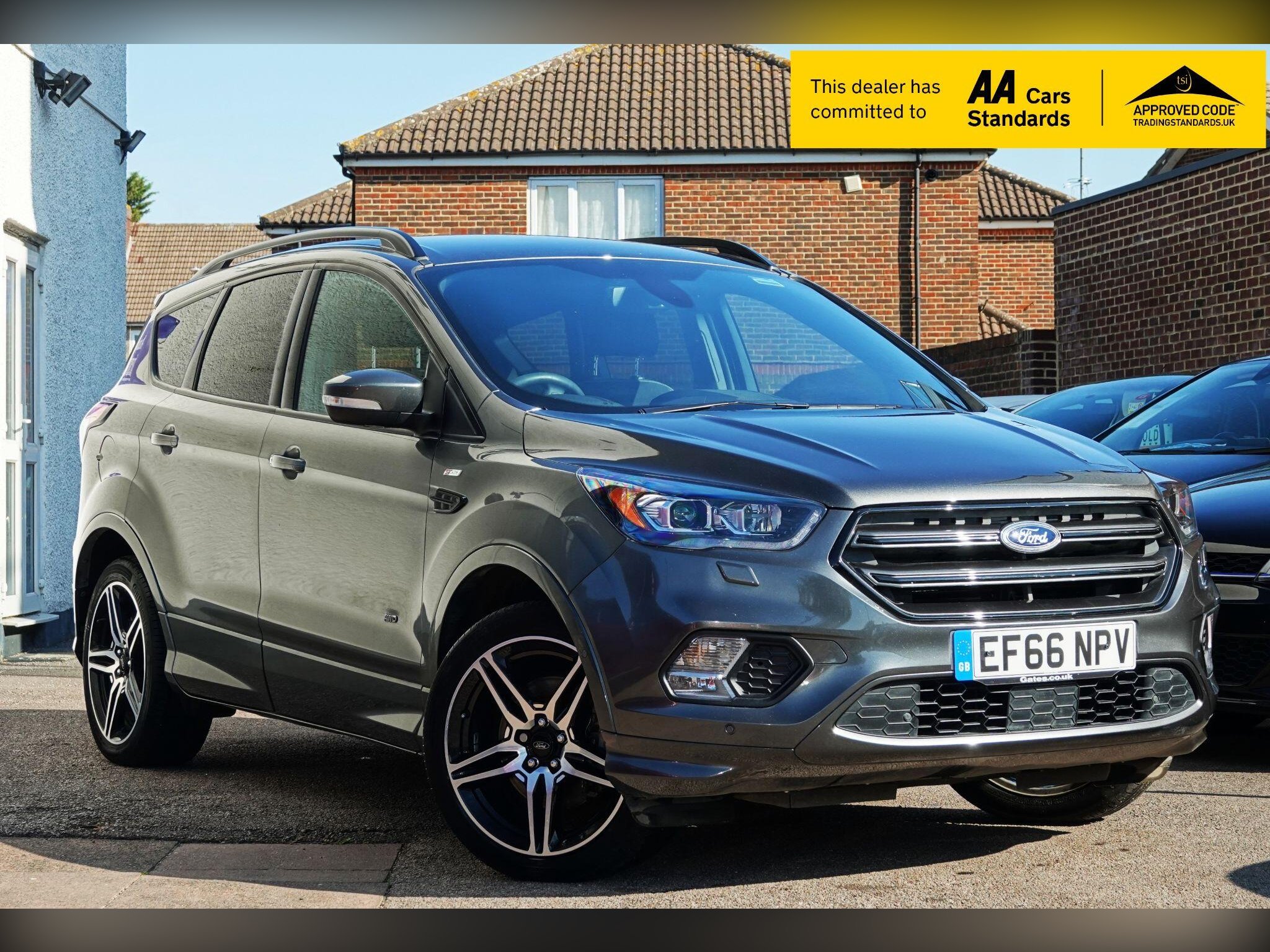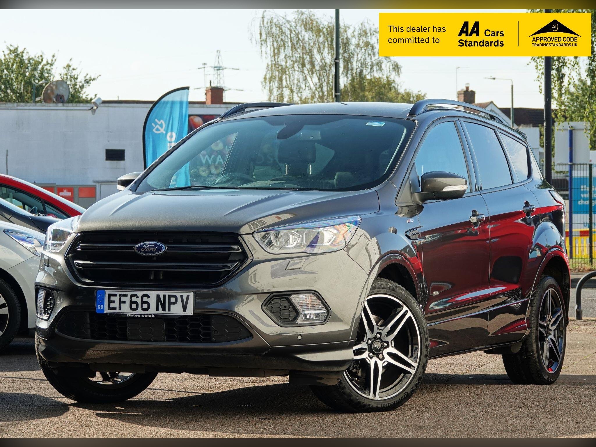 This 2016 Ford Kuga T ST Line offers exceptionally low mileage for its age, having covered just 18,775 miles. This desirable Four Wheel Drive model is presented in Euro 6 specification and benefits from a clear vehicle history check and a full service history, with its last service completed on 19th September 2025 at 18,775 miles. It has had only two owners from new and will be supplied with 12 months MOT. Notable features include a rear view camera with parking assistance, a driver assistance pack with blind spot assistance, a premium Ford DAB navigation system with Ford SYNC3 and Bluetooth, a power tailgate, and 19 inch alloy wheels.